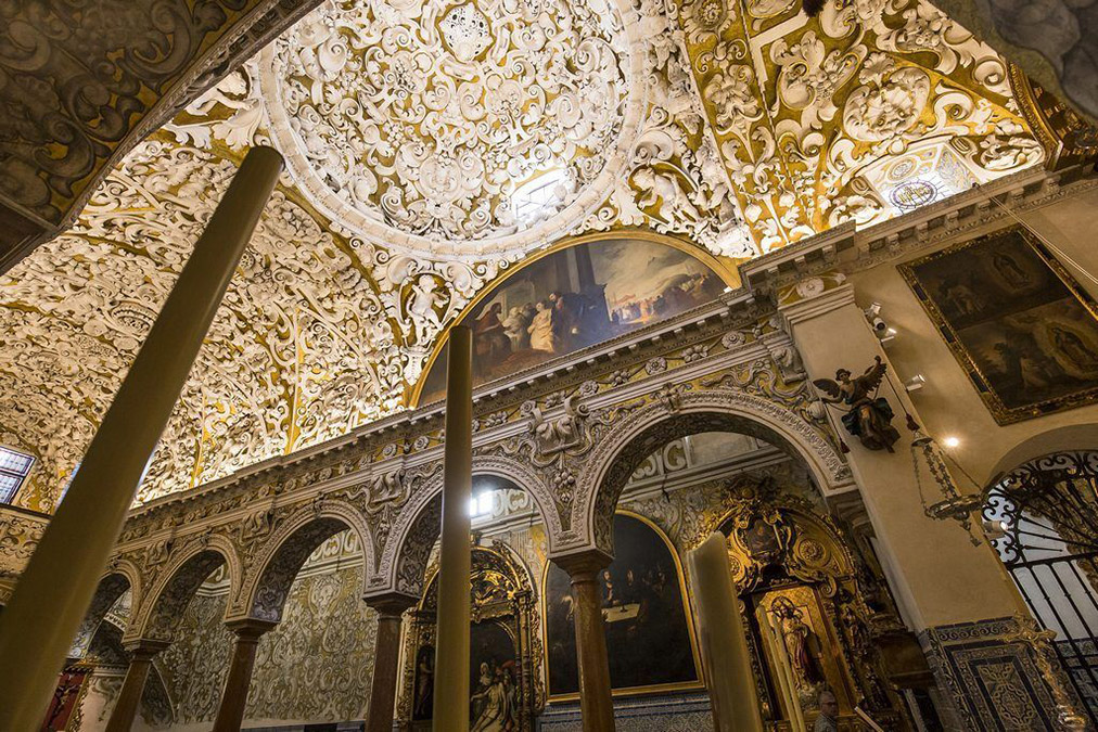Santa María la Blanca es un espacio verdaderamente único. A lo largo de su historia, este lugar ha cobijado a las tres grandes religiones monoteístas. Más de un milenio de oración honra este lugar y hace de ella Casa de Dios y Puerta del Cielo en este mundo, según reza la inscripción de su fachada: HAEC EST DOMUS DEI PORTA CAELI 1741. De la mezquita que fue, de los siglos XI al XIII, se conserva el patio de abluciones y su portada principal en el costado izquierdo del templo. Tras la reconquista de Sevilla en 1248 por Fernando III, la mezquita fue confiada a la comunidad judía que hizo de ella su lugar de culto. Para ello, amplió su perímetro y reorientó el edificio según el eje este-oeste que hoy presenta. Aquí, la comunidad judía vivió su fe durante algo más de un siglo, hasta la revuelta antijudía que se desencadenó en Sevilla el 6 de junio de 1391. Tras ella, ante una judería prácticamente desierta, el Cabildo Catedral se hizo cargo del inmueble que acondicionó para el culto cristiano. De su pasado judío conserva, además de los muros perimetrales, una serie de ventanas saeteras en la planta superior y los anaqueles donde se guardaban los rollos de la Torá, aunque todos estos elementos quedan ocultos tras las yeserías